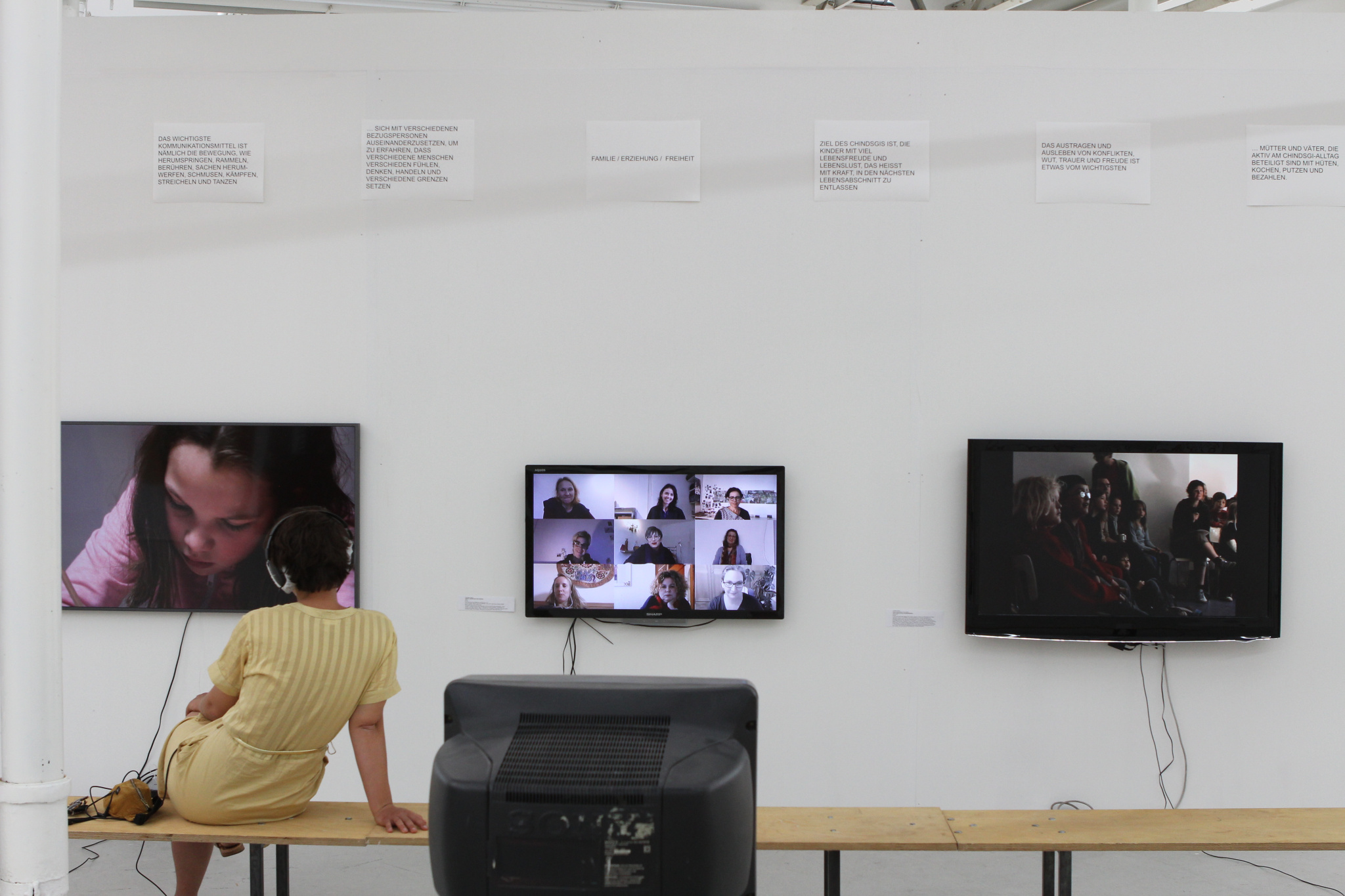 Exhibition view, Familienmodell(e), Shedhalle, Zürich, 2020, Video Links: Martina Rieder, Monterana – Selbstgestaltenes lernen; Video Mitte: Françoise Caraco, Familie–Erziehung–Freiheit; Video rechts: Cinemas Copains; Freie Schule am Mauerpark, Leitsätze Marlene Bill, Chindsgi Rote Fabrik, Foto: Shedhalle Zürich