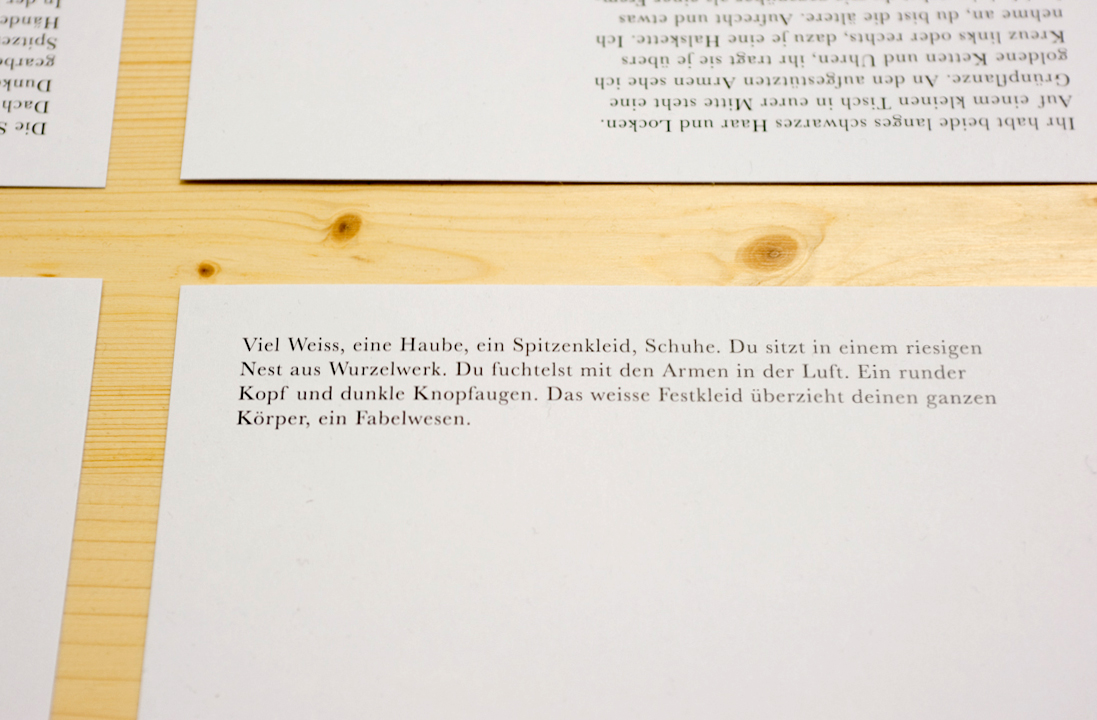 The artist has taken the available and patchy archive material from the early twentieth century, carefully reviewed it, interpreted the content and formally transformed it. The customary black-and-white family portraits from the epoch have been translated into short texts in which she tries to descriptively reconstruct the interrelations between the depicted people themselves and with the simultaneously transported contexts. Caraco deploys an actress to read aloud the written details of the dates and locations derived from the respective pictures in the form of a mundane list. The empty reverse sides of the photos on which family members are shown are transformed by the artist into abstract pictures, projected in sequence with textual fragments from the written correspondence onto a wall. Using these three forms of translation Caraco reconstructs links and correlations that generate a new present-day image of the past. At the same time the blank reverses and the fragmented texts indicate losses and voids.